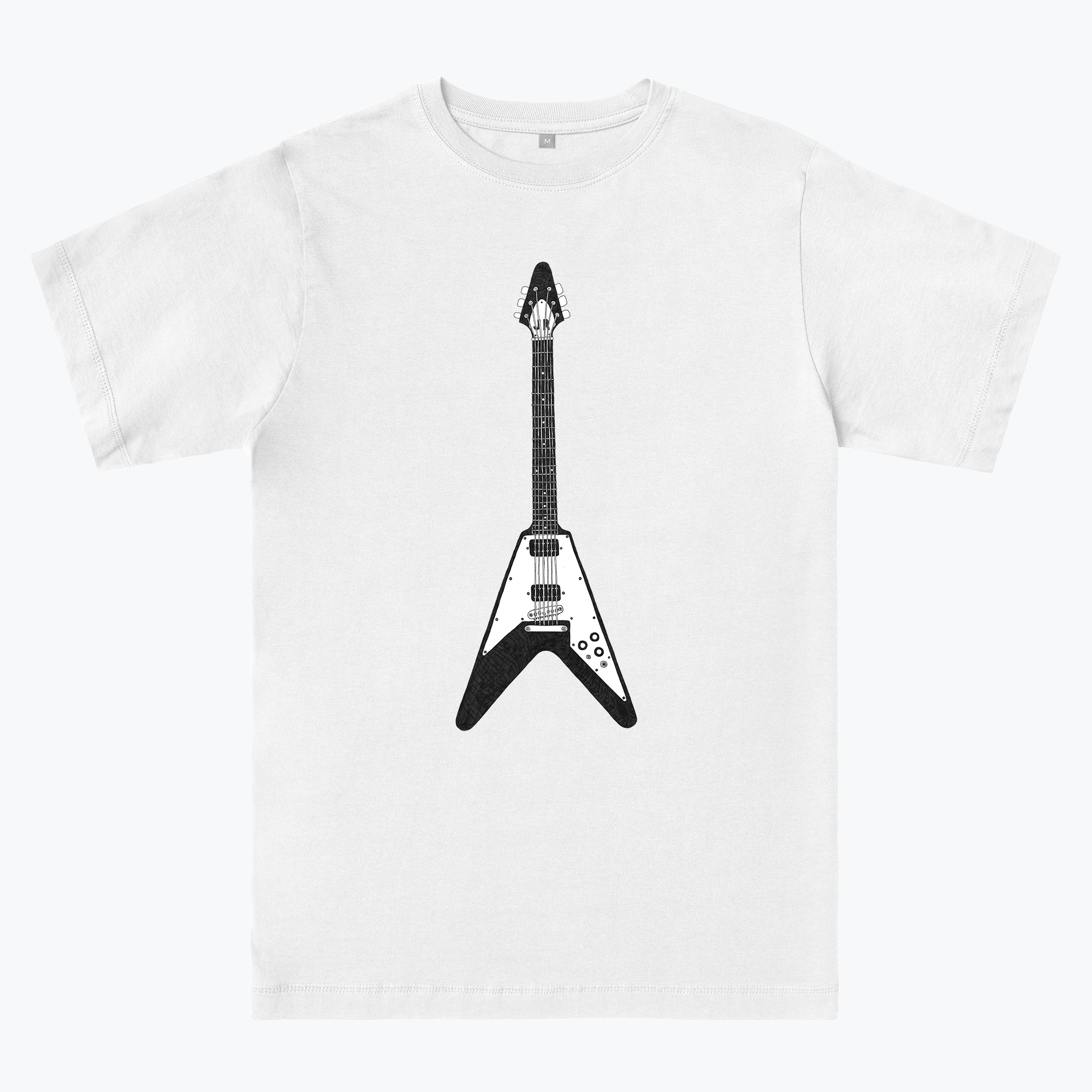 This T-shirt was created in memory of the garage rock musician Jay Reatard (1980-2010). Drawn by Jonathan Lindley using a black pen on A2 paper, this design depicts a Gibson Flying V – one of Jay’s trademark guitars. The brand name has been taken off the headstock and replaced with the initials ‘JR’ We felt that the Flying V was the best choice of symbol to embody Jay, his life, and his music.